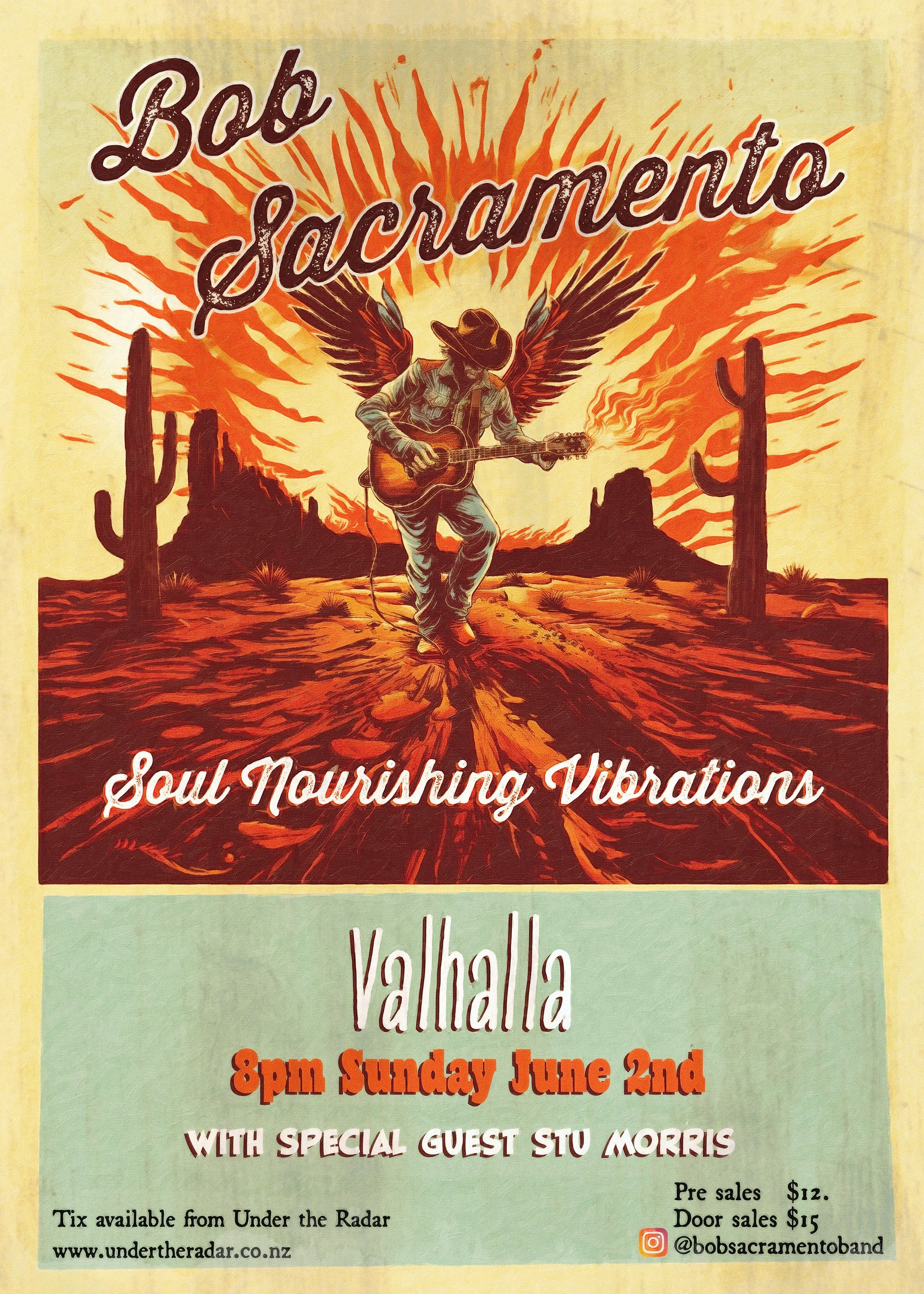 Bob Sacramento Live! Sunday, 2 June 2024 7:30 pm 10:00 pm Valhalla 154 Vivian Street Wellington, Wellington, 6011 New Zealand (map) Google Calendar ICS Bob Sacramento is bringing their American inspired folk-indie act to Wellington. Local artist Stu Morris will be performing with his band for the first time this year (and we are stoked to have him)!!Doors at 7:30pm$15 Door sales TICKETS $12
